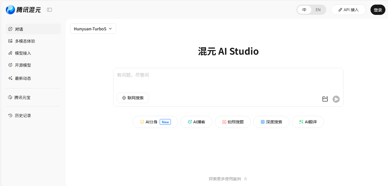 • 选择模型:在界面的左上角,选择不同的模型,例如“Hunyuan-TurboS”。