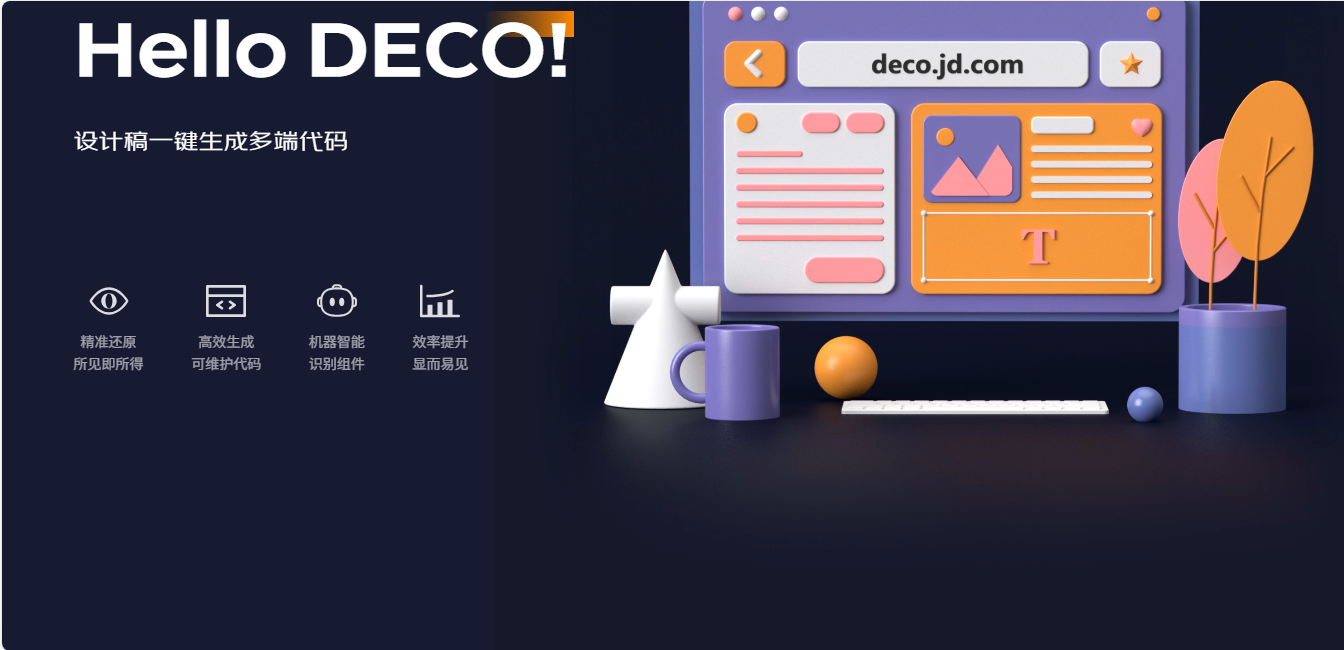 Deco 是京东推出的智能将设计稿一键生成多端代码(支持生成 Taro、React、Vue、HTML等)的工具, Deco 是 Design 和 Code 的两个词的合并,代表 Design To Code,即从设计稿生成代码。