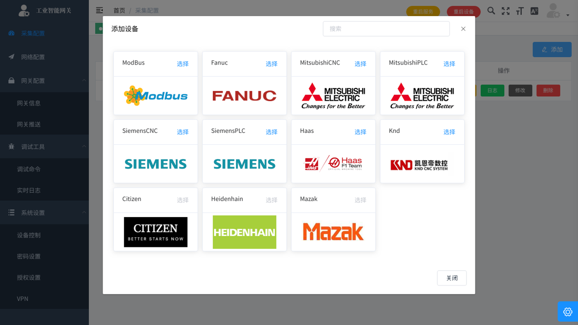 支持采集的机床型号包括:发那科(Fanuc)、西门子(Siemens)、三菱(Mitsubishi)、哈斯(Hass)、凯恩帝(knd)、海德汉(Heidenhain)、力士乐(Boschrexroth)、兄弟(Brother)、广州数控(GSK)等。网关配置,发下图:
