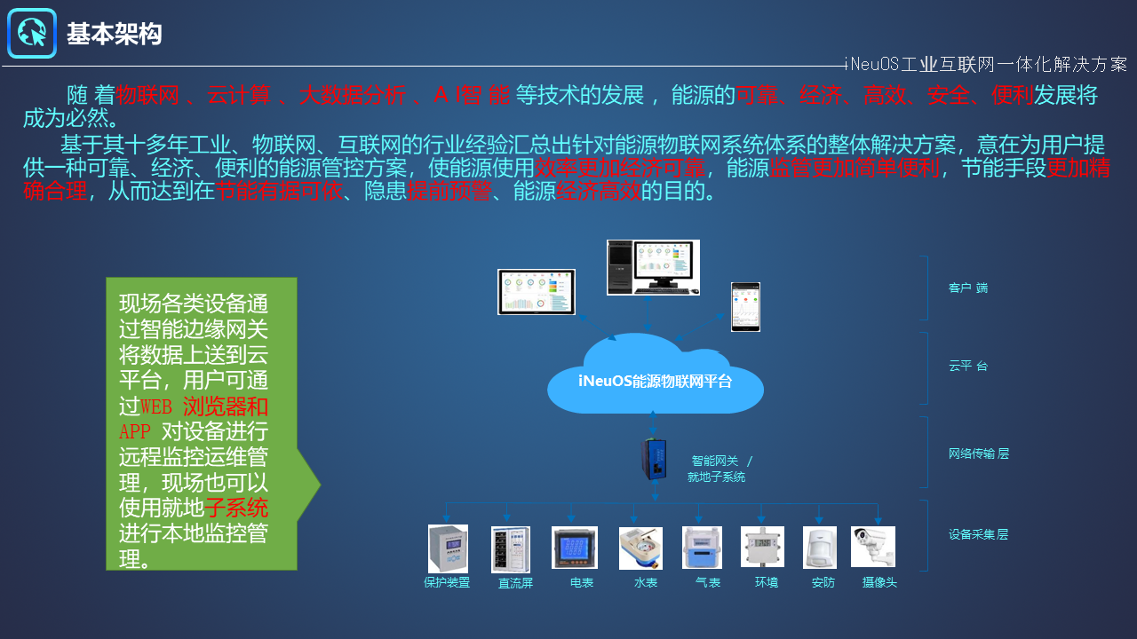 充分利用物联网、大数据、工业互联网等先进理念和技术,提升工业企业的自动化、信息化、智能化水平。以数据为中心、以生产过程为核心、以工具赋能构建业务功能,实现设备状态监测及预警、生产过程优化、科学智能决策、降低能源消耗等业务。