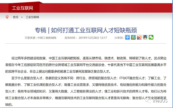中国工业互联网从 0 向 1 演进从缺政策、缺技术、缺市场,逐渐转移到了缺人才,跨行业、跨领域的复合型人才;IT与OT融合型人才;了解工业、了解数据分析、了解工业机理的复合型人才;既懂工业运营需求、又懂网络信息技术、有较强创新能力和操作能力的复合型人才;既有专业领域的知识、又懂得大数据、人工智能新算法的人才;懂工业和新兴技术的跨界人才等。
