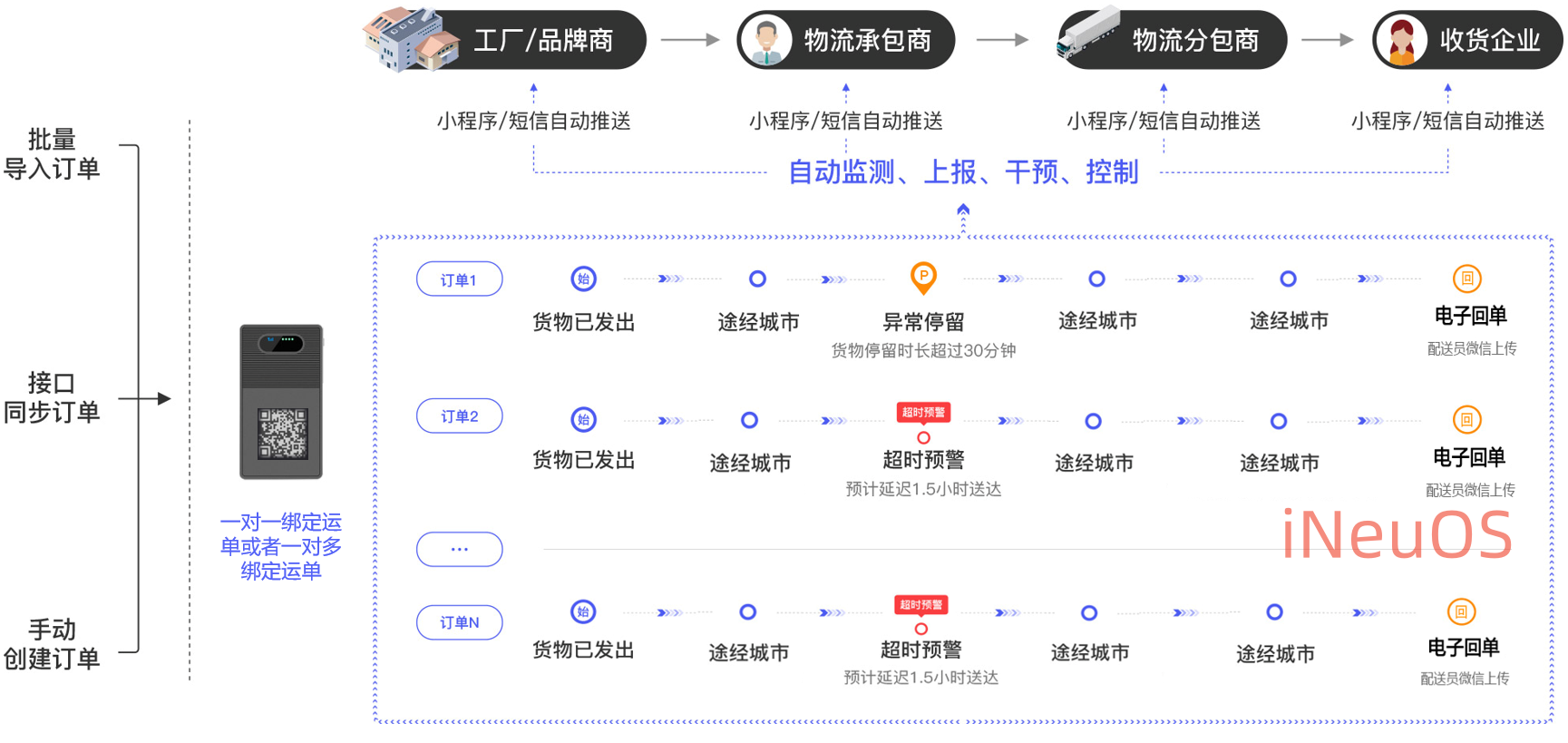 实现线路自动匹配优化、安全交接装车扫描、电子围栏在途跟踪、在途事件预警、实时位置轨迹回放等功能。不仅能大幅提升配送时效,支持多端角色随时通过手机查看管理。
